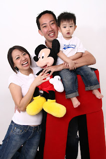 it's a 1st march 2008 saturday morning as we head down to bugis for our 2nd family portrait. pretty apt as ryan's gona turn 2 in 2 weeks! mummy decided that we should dress in jeans and a white top. brought mickey and pluto along (frm HK disneyland, bought by grandparents from both sides) since they were part of the pic taken a year ago. how our boy has grown since! the make-up artist wanted to do up ryan's hair but i firmly rejected!! OMG! the entire shoot took 2 hours and we were trying soo hard to get ryan to be in position or rather to smile at the camera amidst running ard and ransacking the toys they provided. we moved between 2 studios but we prefered the white background over the green! nice pic of my groovy boy who NEVER fails to dance to any music being played anywhere! just 2 days ago, he went on his own up a stage near the coffeeshop near mama's place (palm gardens) and started line dancing which gong gong has been teaching him! wat a sight! he went forward, backward, did a turn with hands moving to an invisible beat! he dozed off in the car and had a long nap before we went over to daddy's parents place for dinner.